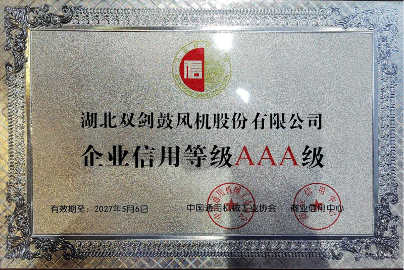 雙劍風(fēng)機(jī)憑借雄厚的生產(chǎn)經(jīng)營實力和良好的市場信譽,被中國通用機(jī)械工業(yè)協(xié)會(CGMA)和商業(yè)信用中心授予“企業(yè)信用等級AAA級”榮譽。